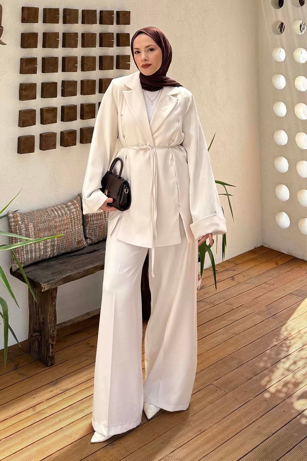 Derin Pens Detaylı Tesettür Takım Beyaz