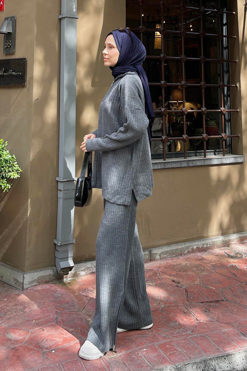 Düz İkili Triko Tesettür Takım Füme (REY0316)