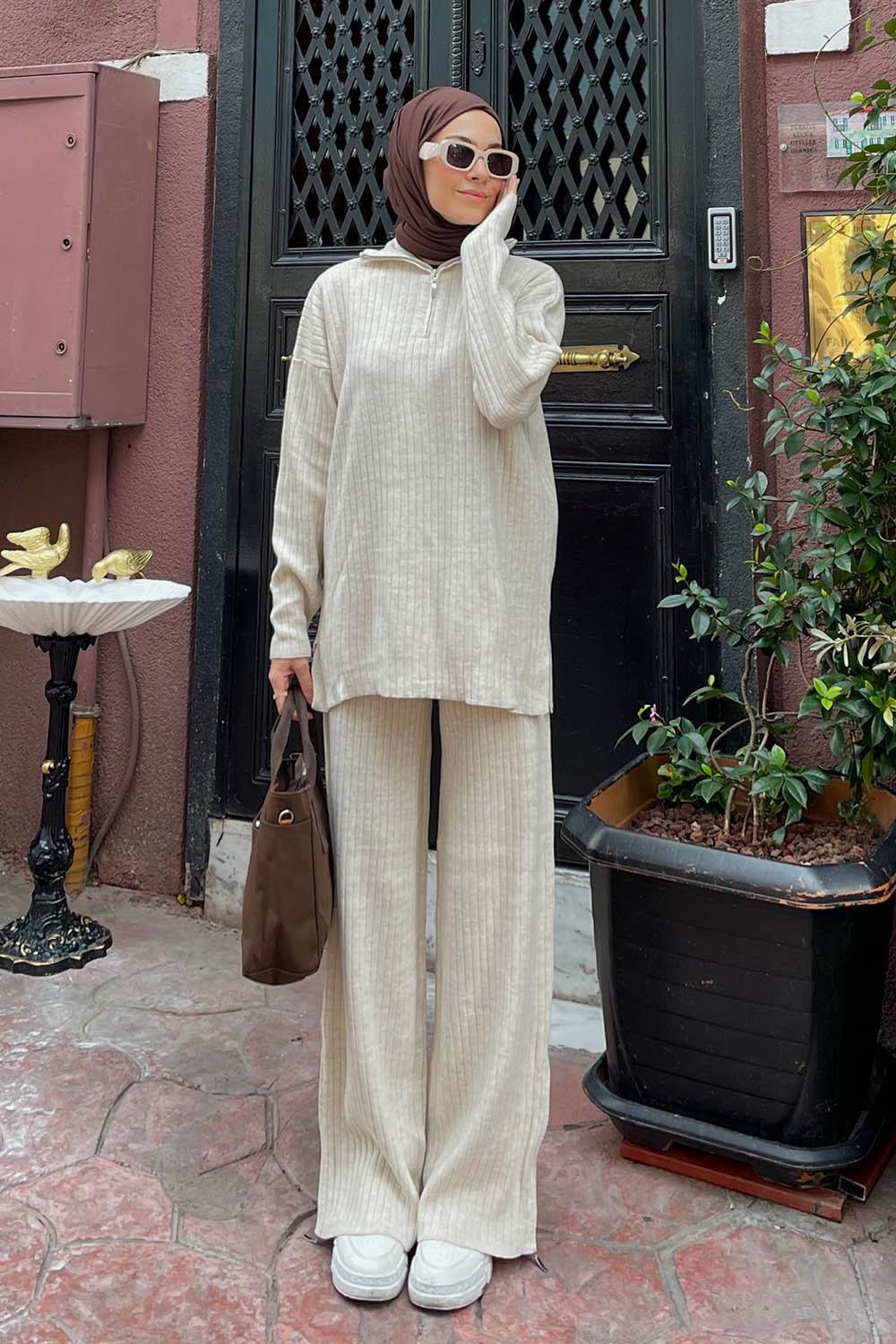 Fermuar Detaylı Pantolon Tesettür Takım Krem (REY0016)