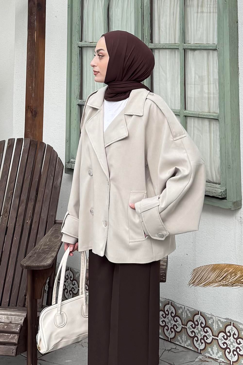 Kruvaze Kısa Tesettür Trençkot Taş (EFI7537)